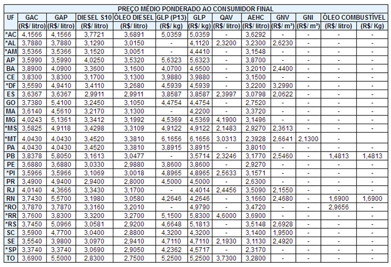 Divulga o Preço médio ponderado ao consumidor final (PMPF) de combustíveis.