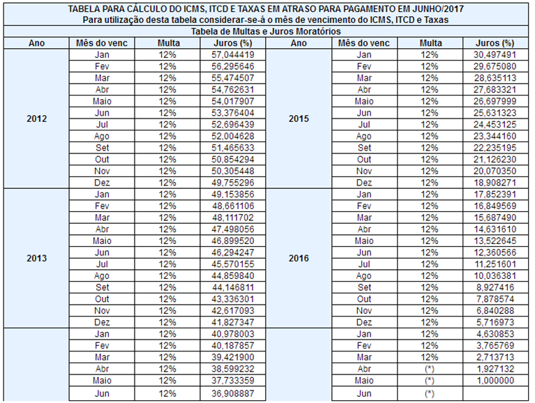 CONSIDERANDO a conveniência de instruir as Repartições Fazendárias, os Contribuintes e os Contabilistas, publica tabela para cálculo do ICMS, ITCD e Taxas em atraso, para pagamento até junho/2017, nos termos do art. 2° da Resolução n° 2880/97.