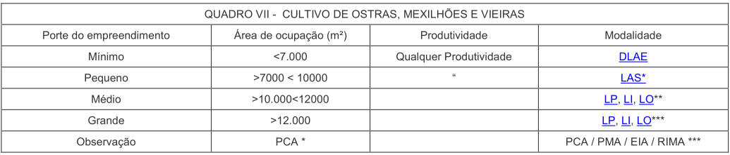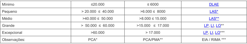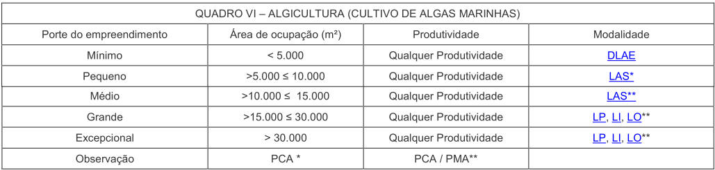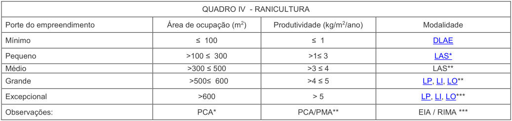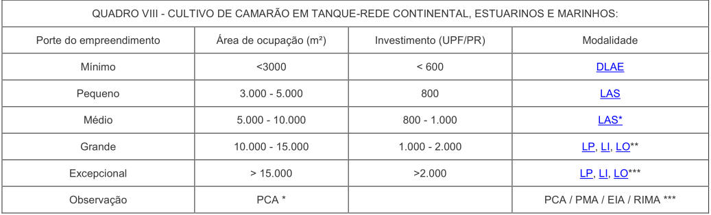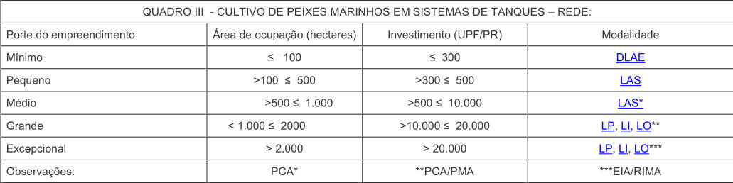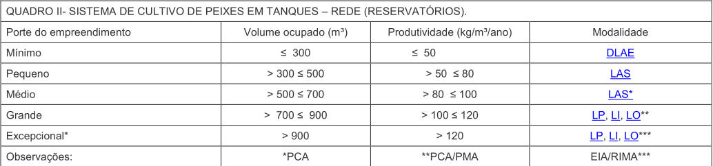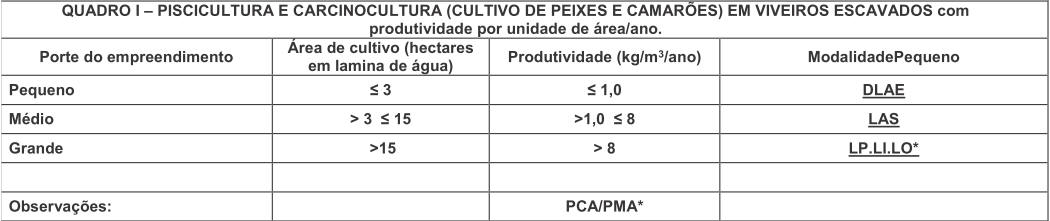 § 1° Na implantação de viveiros escavados (Quadro I) para o porte pequeno será emitida DLAE.
